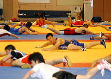 男子両スタイルの全日本チームが5月29日、東京・味の素トレーニングセンター(ナショナルトレーニングセンター=NTC=から改称)で、ジュニアの世界選手権(8月、トルコ・アンカラ)とアジア選手権(7月、フィリピン・マニラ)の代表候補選手とともに2泊3日のミニ合宿をスタートした。新体制になってからシニアとジュニアの合同合宿は初めて。総勢約80選手が6面マットで汗を流した(右写真)。