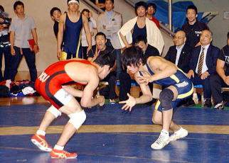 Aグループは6回戦で前年覇者の山梨学院大と同3位の拓大が全勝対決。拓大が55kg級を落としたものの、その後5連勝し、5−2で勝って成績を6戦全勝とした(右写真:拓大の高谷惣亮=青=が山梨学院大の森川一樹に勝つ)。