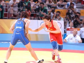 カルタショバは2002年に20歳で59kg級世界チャンピオンに輝き、63kg級で2004年アテネ五輪にも出場(8位)。欧州選手権も3度優勝しているロシアの強豪。北京五輪の決勝戦は伊調馨選手(ALSOK綜合警備保障)相手に第1・2ピリオドとも2分間を0−0で終わり、ともにクリンチ勝負で惜敗していた(右写真)。
