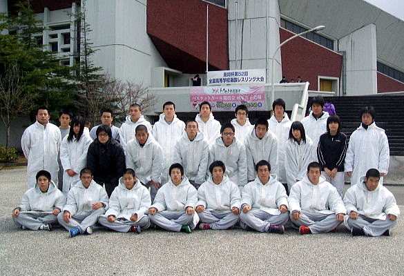 水産業に就職希望の全国の中学レスラーたちが、“資格ブーム”に便乗してレスリング部がある海洋高へ進学を希望すれば、”畑”と便乗して、2倍も3倍も速く強くなれることは確実だ。「レスリングをやりつつ、『将来は船長になりたい』なんて生徒がいたらいいね」と三村氏は理想を話す(右写真:初の団体戦全国大会出場を果たした海洋高選手=新潟市体育館前、提供=三村氏)。