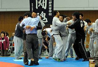 部員も各学年10人程度になり、全階級にフルエントリーできるようになった海洋高は、その総合力を生かして、昨年秋の京都府予選で、昨年の全国高校選抜大会王者の京都八幡高を撃破した(右写真:全国王者を撃破し、喜ぶ海洋高の選手ら=提供・三村氏)。