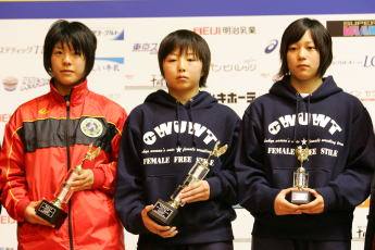 最優秀選手賞は阿部、優秀選手賞は田中、敢闘賞は49kg級優勝の志土地希果(愛知・至学館高)がそれぞれ受賞した(右写真=左から田中、阿部、志土地)。