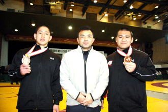 「大分県でレスリングをやりたい人はいるんですが、練習する場所がないんです。学校には、よく「レスリングをやりたい」と外部の方から問い合わせが数多くあります。キッズクラブからシニア教室のことまで多数です。なので、文理大学、付属高校以外の選手でも、うちで練習してもいいようにマットを開放します。柔道部や野球部の生徒の掛け持ちも、受け入れます」。勝監督は、日本文理だけではなく、大分県全体の強化、そして西日本、全国へとつながる強化を思い描いている(左写真:個人戦3位の66kg級・吉田幸司=左=120kg級の坂元将悟とともに)。