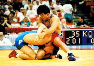 日本チーム入りしていた時に日本協会がロシアから招へいしていたセルゲイ・ベログラゾフ・コーチ(五輪2度を含め世界V8)に指導を受け、根性論より合理的にレスリングを強化する術を会得していることが大きい。「今でも役に立っている」と話す(右写真=1995年世界選手権で闘う勝龍三郎監督)。