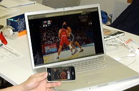 | 北京五輪の試合DVD。このすべてがパソコンに収められた。 | 試合を上映するパソコンと、ダビングしたiPhone。持ち運びが簡単になった。 | 2月の欧州遠征もDVDへ収録。全日本チームのIT化はかなり進んでいる。 |
