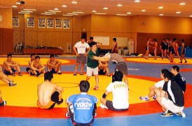 | 佐藤強化委員長(手前)伊藤広道コーチ(向こう側)の熱烈指導。 | フリースタイル・チームに技術指導する佐藤強化委員長。 | グレコローマン・チームに新ルール下での闘い方を指導する伊藤コーチ。 |