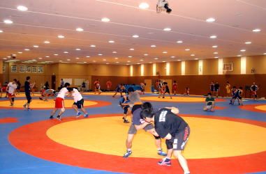 男子両スタイルの全日本チームが4月1日、今年度第1回(今年5度目)の合宿をスタート。午後4時から1時間のスパーリング、1時間の技術練習、30分間の補強と休む間なく続け、初日からハイスパートの練習を展開した(右写真)。