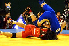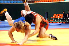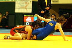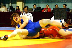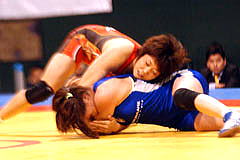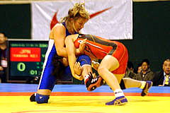 | 《試合経過》第1ピリオド1分すぎ、山名はがぶり返しを受けて2失点。0−2でこのピリオドを落とした。第2ピリオドは30秒にタックルからアンクルホールドで2−0とリード。しかしラスト10秒に3点のタックルを決められて2−3へ。勝負をあきらめなかった山名は、相手をがぶったあと、がぶり返しで2点を取り、執念の逆転勝ち。 第3ピリオドは20秒に山名の片足タックルが決まって2点。ニアフォールを5秒以上続けて1点を加え、3−0とした。 | ||