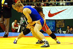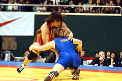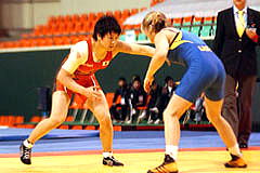 | 《試合経過》第1ピリオドは2分間を0−0で終わり、ボールピックアップでクリンチの攻撃権を取った井上がテークダウンを決めた。第2ピリオドもなかなかポイントが取れなかったが、1分40秒、井上がタックルから場外に出して貴重な1点を取り、勝負を決めた。 | ||
