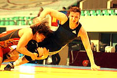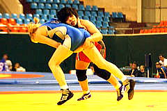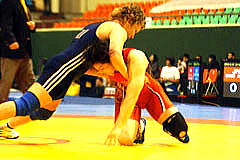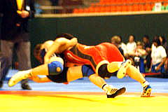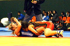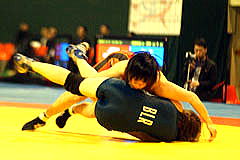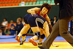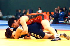 | 《試合経過》第1ピリオドの中盤、松川がタックルから回り込んで1点を取り(左写真)、1−0でこのピリオドを先制。第2ピリオドも中盤にテークダウンを奪い、さらに1点を加えて快勝した。 | ||