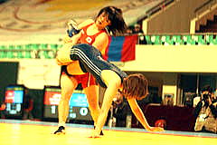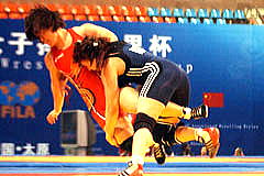| 《試合経過》第1ピリオド中盤すぎ、井上がタックルで攻め(左写真)、ガッツレンチで攻めたが、これは失敗して逆にポイントを取られ、1−1とされた。このままではラストポイントで負けるが、ラスト20秒、タックルを決めて2−1とした。第2ピリオドは2分間を0−0。クリンチの防御となった井上は、相手の攻撃を防げずに1失点。 第3ピリオド、開始15秒で1点を取った井上だが、ラスト3秒にタックルを決められ(右写真)、痛恨の3失点。目前の勝利を逃した。 |