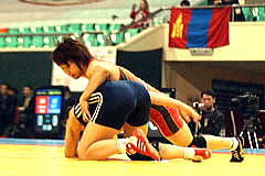 | 《試合経過》第1ピリオドの中盤、山名がタックル。こらえられたが相手を持ち上げて1点をとり(左写真)、ガッツレンチ2回転で4−0へ。第2ピリオドは40秒に場外際のタックルで3点を取り(右写真)、ラスト30秒に回り込んで1点を加えた。 | ||