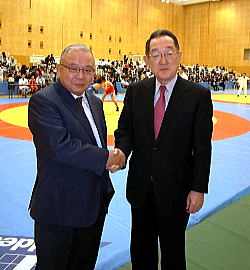 役員改選に伴い、3期6年間会長を務めた岩名秀樹会長が自らの退任と「連盟創立時から連盟の普及発展に努められてきた今泉雄策副会長を後任の会長に指名したい」旨の提案を理事会にはかり、満場一致で決定した(右写真:岩名会長=右=と今泉新会長)。岩名会長は顧問に就任する。池田進、市口政光両副会長は再任、新しく木口宣昭副理事長が副会長にそれぞれ満場一致で決定し、就任した。