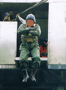空挺団に所属すると、まず習志野駐屯地で飛び降りる訓練を受ける。1999年6月に全日本チームが体験入隊し、いくつかの訓練に参加したが(右写真:高さ11メートルの降下台から飛び降りる選手=画像処理しています)、一般の人にはとてもできない厳しい訓練の連続が待っている。ここで模擬降下を十分に練習し、やっと空を飛ぶことになる。