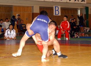 1993年10月の徳島国体少年の部では2回戦で豊田(以下、回想部分については敬称略)と対戦し、3分44秒、豪快な俵返しで投げられテクニカルフォールで敗れている(右写真=豊田に投げられたシーンが機関誌「月刊レスリング」の表紙に使われた)。この時点で両者の実力差は、オーバーな表現でなく天と地ほどあっただろう。