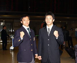 今回金メダルを取った長谷川と稲葉は、2006年の「デーブ・シュルツ国際大会」(米国)に学生選抜チームのメンバーとして参加し、ともに銀メダルを取っている(右写真:帰国時の稲葉=左=と長谷川)。違うスタイルのライバルとして、上を目指して競ってきた。現在は長谷川が全日本選手権に2連覇し、北京五輪代表権獲得に挑むなど、一歩先を走っている状況。そのライバル意識も金メダルの原動力だった。「(長谷川が金を取って)フリーでも絶対に取らなければならないと思いました」。ライバルは同じ階級の選手だけではない。