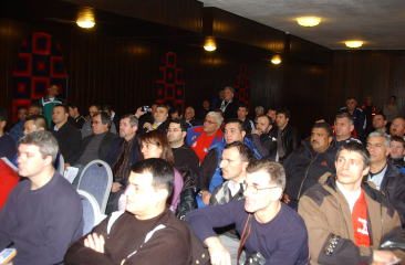 13日には審判・各国代表合同のルール説明会が行われ、FILAの理事であるチェノ・チェノフ氏(ブルガリア=欧州レスリング連盟会長)が審判および各国代表に新ルールを説明(右写真)。日本からは芦田隆治審判員(大阪・大阪工芸高教)、藤本賢一審判員(奈良・二階堂高教)、元木康年グレコローマン監督(自衛隊)が参加。チームに同行しているブルガリア語が堪能な筒井穣さん(セルビア在住=日本サンボ連盟副審判員長)の通訳のもとで細部のルールを確認した。