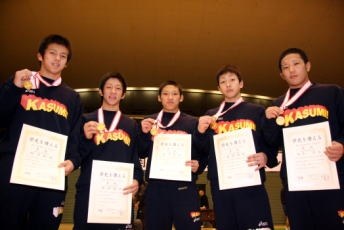 今大会の個人戦では74kg級までの5階級で優勝している(右写真=左から66kg級・砂川航祐、50kg級・折田誠治、55kg級・森下史崇、60kg級・岩渕尚紀、74kg級・坂本悠太)。軽量級中心に白星を重ねて勝負をかける。120kg級の前川勝利の成長も著しく、ここでの勝負となっても対応できるチーム力を持つが、大沢監督は「84kg級までに決める」とキッパリ。軽中量級に突出した選手を擁する霞ヶ浦が、グランドスラムに向けて幸先いいスタートを切った。