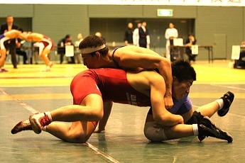 記念すべき1回戦は、2007世界銀メダリストの笹本睦選手(ALSOK綜合警備保障)の母校でもある向上高の植北功選手。今大会、団体で3位に入賞した強豪校の選手を相手に富岳選手は1ポイントを奪うなど善戦。敗れはしたものの、部の新しい歴史をスタートさせ、本田監督の表情は満足気。約3年かけて選手を育成し、ようやく関東の大会に選手を送り込むことができたからだ(左下写真:部初の関東選抜大会のマットで闘う富岳選手=赤)。