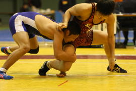 | 55kg級決勝 昨夏の2年生50kg級インターハイ王者・森下(霞ヶ浦=青)が勝つ。 | 84kg級決勝 細谷(花咲徳栄=赤)がインターハイ王者の菊池(霞ヶ浦)を撃破。 | 5階級制覇の霞ヶ浦。左から砂川(66)、折田(50)、森下(55)、岩渕(60)、坂本(74)。 |