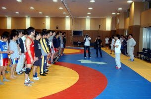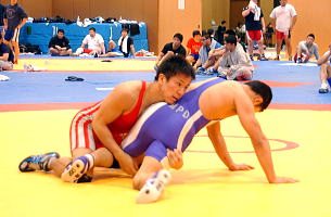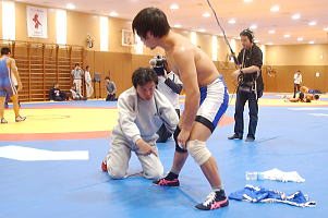 | 今年2回目の合宿は総勢50選手の参加。 | 練習試合終了後、時に手取り足取りで技術指導を行った佐藤満強化委員長。 | 報道陣を一番多く集めたのはフリースタイル55kg級の湯元進一(自衛隊)。 |