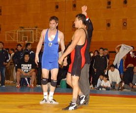 全日本マスターズ選手権に、全日本選手権などでは取材する側で会場にいる新聞記者が出場した。「THE DAILY YOMIURI(ザ・デイリー・ヨミウリ)」のケネス・マランツさん(左写真)。北京五輪の取材団にも選ばれたらつ腕記者で、B(41〜50歳)74kg級に出場した。結果は、2週間前に痛めた左わき腹の影響もあり、約1分でマットを去るはめに。「100パーセントの状態なら。もう少しいい試合ができた」と残念そう。