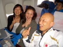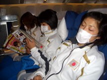 新型インフルエンザ対策のため全員がマスク着用で移動。 飛行機の最後部でウォーキングの甲斐選手。カメラを向けると緊張して右手と右脚が同時に出た。 最近ちょっとした人気者の栄監督。隣合った人から感激される。