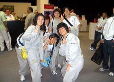 IDカードの発行を待つ間に記念撮影に応じてくれた女子チーム。 ビル・メイ記者と中村亜希子記者(プライバシー保護のため画像処理しています) 男子の練習。中嶋ドクターは佐藤満強化委員長とガチンコ・スパーリング。