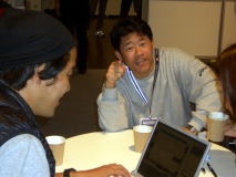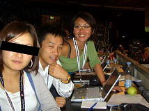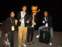 | 男子グレコローマン・チーム之最後の記念撮影をする保高記者。 | ファイナルは豊田コーチが記者席に来て、解説してくれました。 | ホームページの執筆陣。1週間のご愛読、ありがとうございました。 |