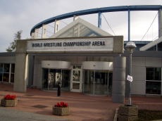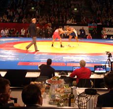 3週間ぶりの対面で、保高記者は中村記者に熱いキッス! ロンドン支局から来た読売・近藤記者(右)。北京五輪までのレスリング担当記者だ。 7日65万円のディナー席。記者席とマットの間にあるのです。 試合会場全景
