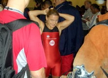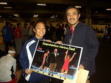 続いて、アメリカの48kg級の世界チャンピオン、クラリッサ・チャンの姿を見かける。8月にポーランドに行った時、ビル・メイさんの通訳でインタビューさせてもらった。母親が日本人なので、日本人に対してとても親密に接してくれるのです。インタビューのお礼にと、去年の世界選手権で優勝した時のパネル写真をつくって持ってきたので渡す。坂本真喜子ちゃんのライバルになる選手だけど、まあ国際親善ということで許してね。