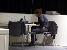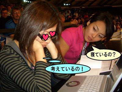 敗者復活戦とファイナルの間の短い休憩時間にプレスルームに戻ると、スタンカ・ズラテバの姿が。足をテーブルに上げてパソコンを見ている。さすがに度胸がよくて、態度がでかい。普通、選手はプレスルームには入ってこないものだし、入らせない場合の方が多い。「パソコンを見たい」とか何とか言ってOKをもらったのだろうけど、女性たるもの、あの格好はちょっとね…。