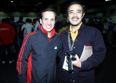 1日1回はこの記者の写真を。日ごとに顔の露出が大きくなっていく!(手前は東京スポーツの菊池カメラマン) シンガポールのコーチになったセルゲイさんと遭遇。 取材エリアをめぐって激しく対立したスタッフと日本からの報道陣。共同・・戸部記者が大人の対応!(中央は保高記者)