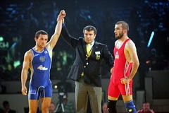 グレコローマン55kg級のハミド・スーリアン(イラン)も、その勝負の厳しさを知ってい選手だろう。2005〜07年に世界一になりながら、北京五輪では3回戦でロシア選手に敗れ、結局5位。その屈辱をばねに、今回も優勝しました。保高記者が、この24歳のイラニアンの大ファン。この日着てきた服の色(こげ茶色)までスーリアンのウォーミングアップの服に合わせるのですから(本人は偶然だと言っていましたが…)。スーリアンもスーリアンだ。試合前だというのに、保高記者を見つけると、ウインクする余裕。すごいね!