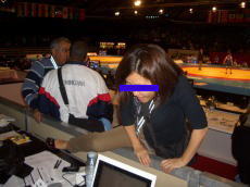 吉田沙保里選手が、自分のデータベースにある写真(左写真)は昔のものだから変えてくれ、とクレーム。サンドナーさんが「女性は若い時の写真の方がいいだろう」と諭したが、「若すぎます」と抗戦。最初に世界カデット選手権に出た時の写真かな? なら10年以上前の写真だ。変えてくれというのももっとも。サンドナーさん、「いまカメラを持っていないから、この大会中に撮影します」と言ってくれた。