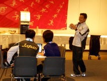この日は女子の栄和人強化委員長が依頼され、藤川コーチ(なぜかフジヤマ・コーチと紹介された)、木名瀬重夫コーチ、坂本日登美コーチとともに指導することになった。通訳はビル・メイさん。栄委員長は最初に「いま私が帽子をかぶっているのでは、指導に神経を遣いすぎて髪の毛がなくなったからです。(悪党を意味する)スキンヘッドではありませんので誤解しないでください」とあいさつ。メイさんがウィットに富んだ通訳をすると、選手は大爆笑。