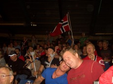 熱狂的な声援を送るノルウェーの応援団。 選手を待つ間にミドルキックの練習の保高記者。あこがれのスーリアンにウインクされ、気分はハイ! 72kg級決勝をスクリーンで見つめるズラテバ。シャツは自衛隊のものでした。