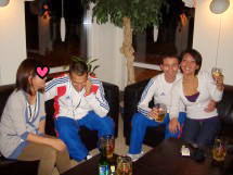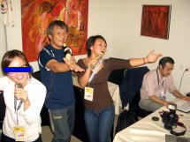 | 中森明菜を絶唱する保高記者。気分は最高にハイ! | 日テレ松川記者と別れの抱擁。保高記者は女性にはよく抱きつく。 | 木名瀬コーチも入ってフィーバー。右端は執筆中の筆者(撮影=菊池) | 最後はメキシコ選手も乱入。世界に顔を売る保高記者でした。 |
