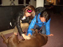 | 筆者が毎日5回、お祈りしたイスラム教徒のための部屋。(ウソ!) | フランス選手に人気抜群だった中村、保高記者。 | ホテルのワンちゃんとたわむれる2人。最高にいい顔をしていた。 |