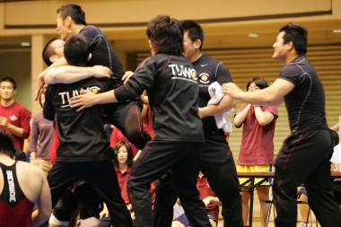 96kg級で優勝が決まり、須藤元気監督は勝った藤本主将に突進して抱きついた。