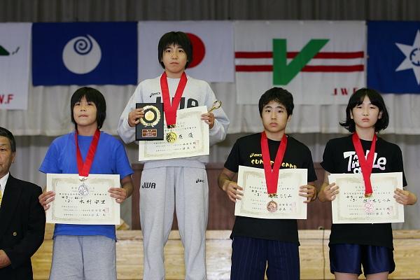 【女子46kg級表彰式】 (左から)2位=木村安里(群馬・千代田)、優勝=宮原優(東京・稲付) 3位=入江ななみ(福岡・横代)、佐々木なつみ(秋田・五城目一)
