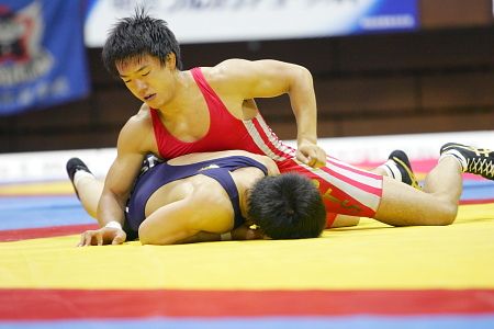 【グレコローマン74kg級プレーオフ】 鶴巻宰(自衛隊=赤)○[2−0(4-0,3-0)]●金久保武大(日体大) 決勝で敗れた鶴巻。気を取り直してプレーオフに臨み、人が変わったような動きのよさで快勝。 2年ぶりに世界選手権のマットを踏む。
