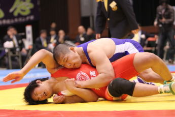 風間杯全国高校選抜大会第2日は3月28日、新潟・新潟市体育館で学校対抗戦の準々決勝から決勝まで行われ、昨年王者の霞ヶ浦(茨城)が飛龍(旧沼津学園・静岡)を5−2で下して2年連続18度目の優勝を飾った(右下写真=優勝を決めた84kg級の松野裕也)。