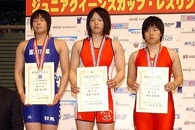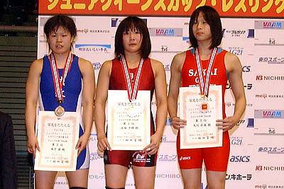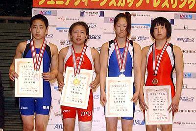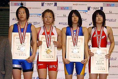 | 堀内(赤)がガッツレンチの連続で第1ピリオドを取り、第2ピリオドはクリンチからの攻撃で勝つ。 | 【表彰式】(左から)2位=田中亜里沙、優勝=堀内優、 3位=平野遥香(日大)、志土地希果(愛知・至学館高) |
