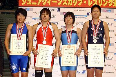 | 第1・2ピリオドとも1−0(第1ピリオドはクリンチ)。小柳(赤)が激戦を制した。 | 【表彰式】(左から)2位=伊藤千草、優勝=小柳絵里、 3位=藤田麻美(静岡・焼津中央高)、我満愛子(青森・青森商高) |