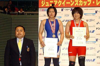 | 立光(赤)は片足タックルから一気にフォールへ。 | 【表彰式】(左から)2位=新井明恵、優勝=立光志織、 |