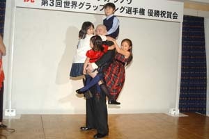 | 長崎さんのマイクパフォーマンスが会場を盛り上げた。 | 力持ちを証明するため5人の子供を抱える! | 出席者全員で記念撮影 |