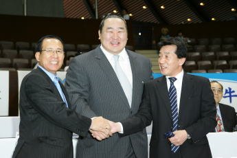 明治乳業杯全日本選抜選手権第1日の試合会場に、今年1月に大相撲を引退した元横綱朝青龍さんが来場した。昨年12月の天皇杯全日本選手権に続く来場で、今回は男子グレコローマン96kg級表彰式のプレゼンテーターを務めた(右写真=日本協会の福田富昭会長、高田裕司専務理事と)。