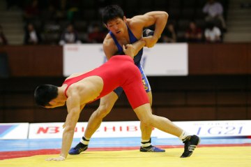 男子フリースタイル66s級は世界3位の米満達弘(自衛隊)が世界メダリストのレベルを見せつけて優勝した(右写真=プレーオフの第1ピリオド、池松を攻める米満)。