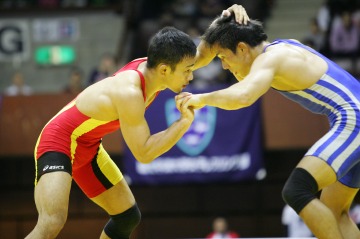 日本のお家芸である男子フリースタイル最軽量級・55s級は、全日本チャンピオンの稲葉泰弘(警視庁)が決勝で湯元進一(自衛隊)に1−2で敗れたものの、プレーオフを制して初の世界選手権代表を決めた(左写真=プレーオフで闘う稲葉)。